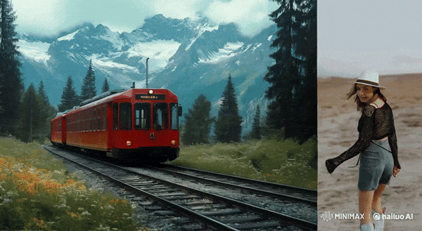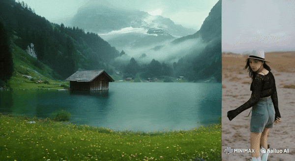 左边的美女完满融合到左边的草地场景中,海螺 AI 的生成结果相当冷艳。
